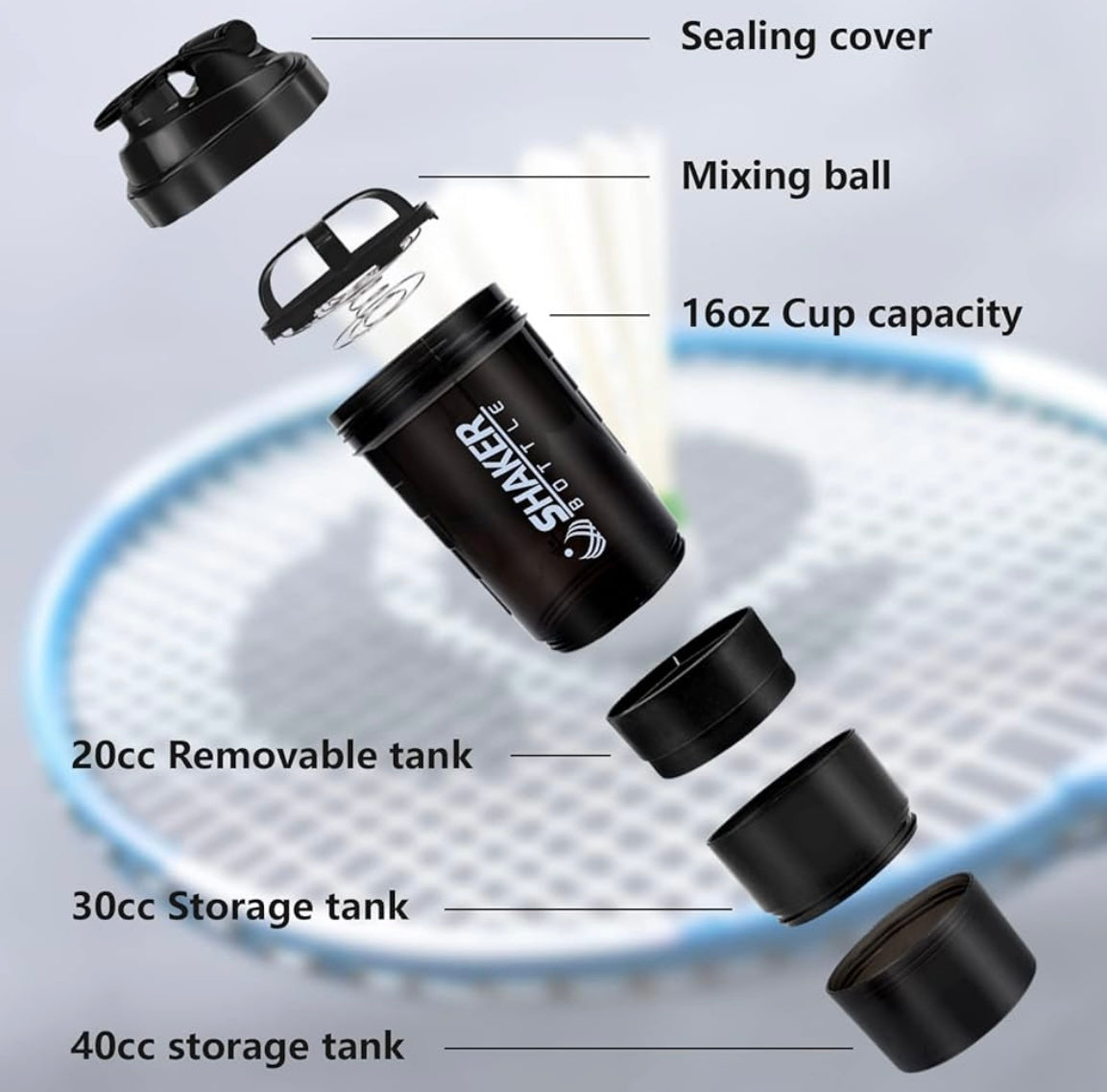 Stay prepared with a shaker bottle designed for seamless mixing, portability, and organized storage for your supplements and hydration needs.